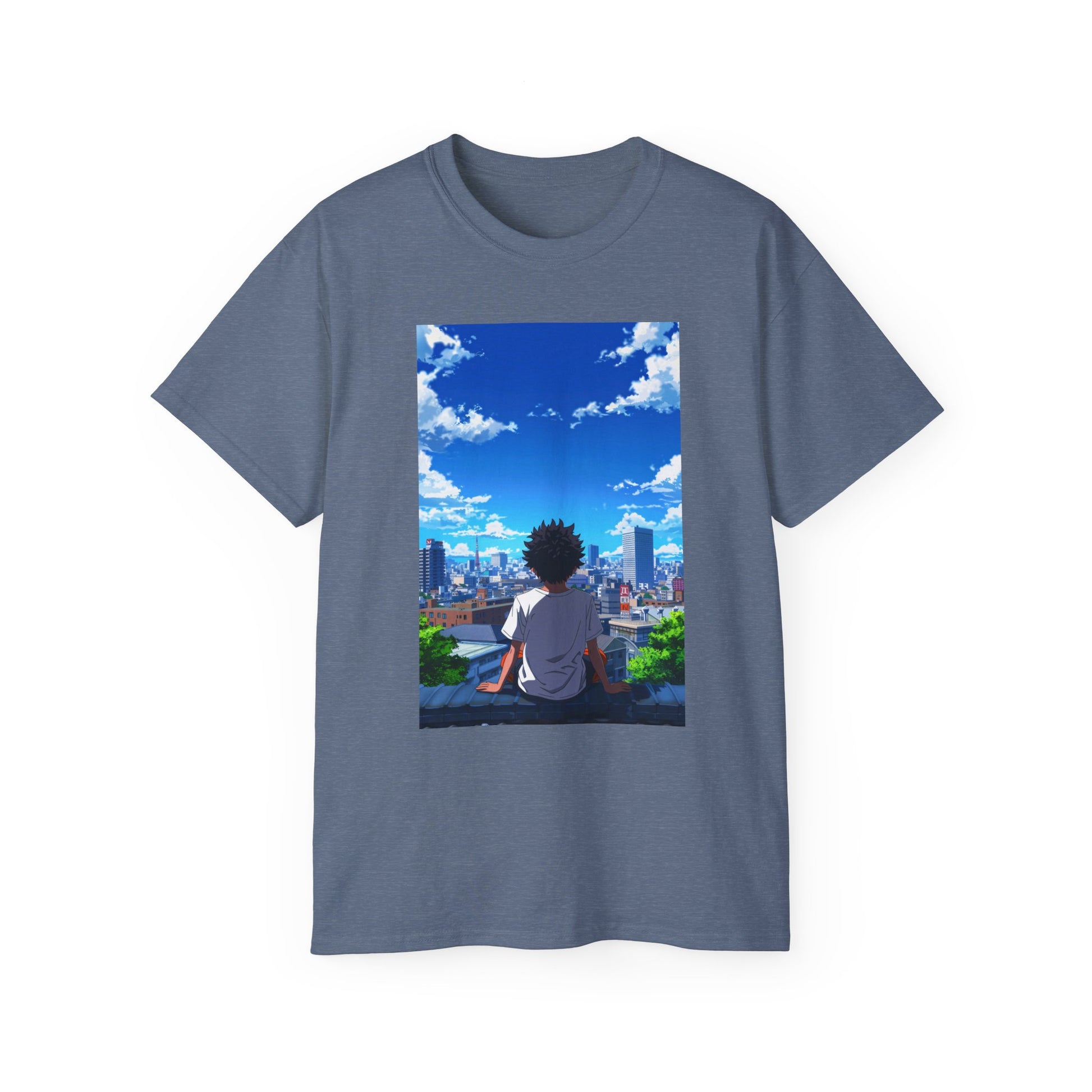 Anime Cityscape Tee — Boy Gazing at Blue Sky Graphic T-Shirt