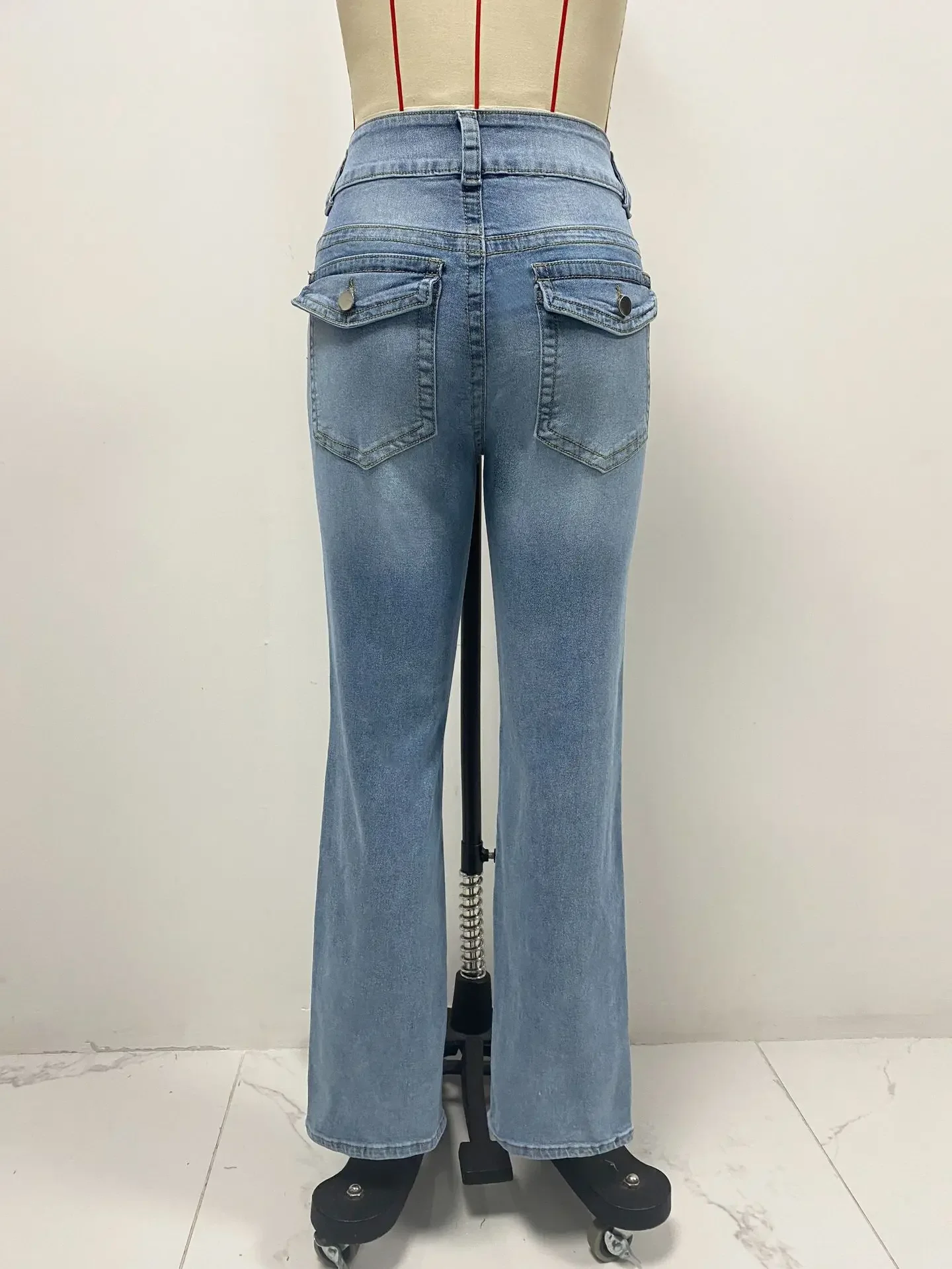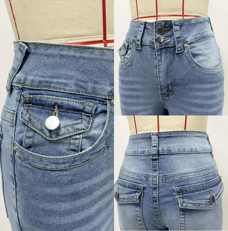 Jeans Pencil Pants Women Vintage Denims Mid Waist Strecth Pockets Buttons Washed Distressed 2025 Streetwear Straight Trousers